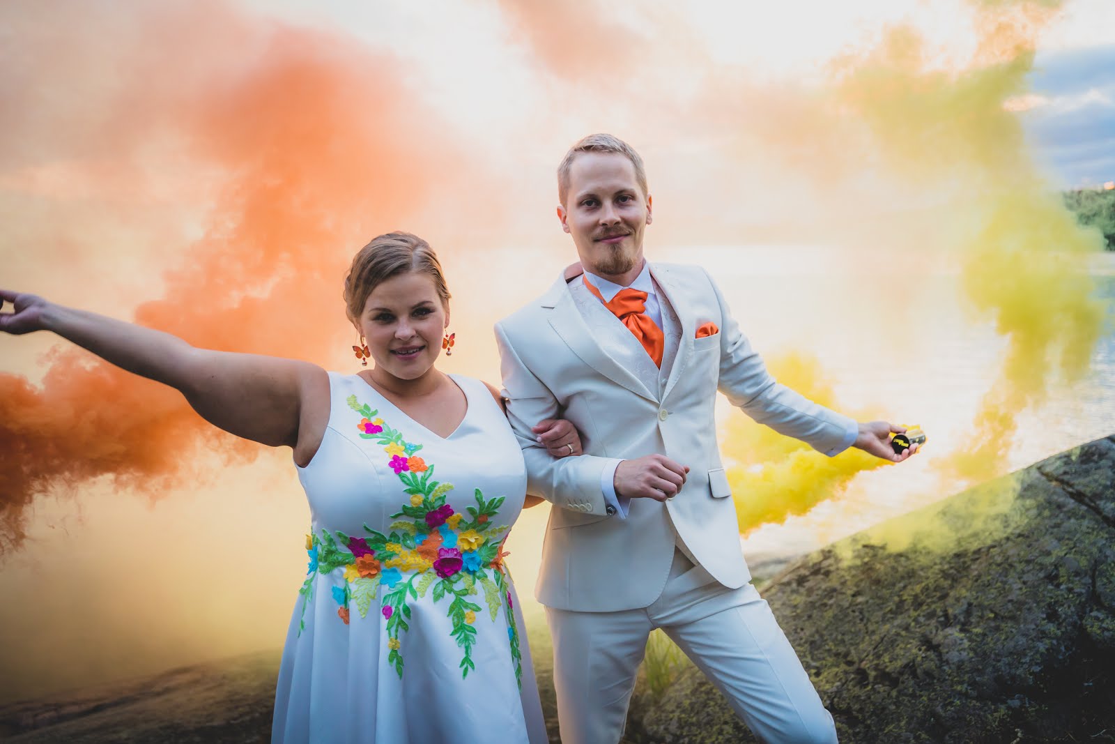 Ilona ja Asta olivat yllätyksesi meille tuoneet mukanaan savupatruunat ja he kysyivät, haluaisimmeko kokeilla niitä osana potrettikuvia. Toki halusimme! Ne toivat aika kivasti väriä kuviin, mutta ensimmäisissä kuvauksissa tahrasivat vähän mekkoni helmaa, mikä harmitti hetkellisesti. Väri lähti kyllä hyvin pois pesussa. Iltakuvauksissa taas heiluttelimme patruunoita päämme yläpuolella, jolloin sieltä lennähti jokin kekäle T:n vuokrapuvun hartialle jättäen siihen tarhran. Ilmeisesti tuokin haitta lähti kuitenkin pesussa pois, sillä vuokrausfirma ei ole lähettänyt laskua perään, vaikka T. toki kirjoitti sinne viestin asiasta. En siis ehkä ihan täysin rinnoin voi suositella patruunoita, vaikka ovathan nämä kuvat aika hauskoja.